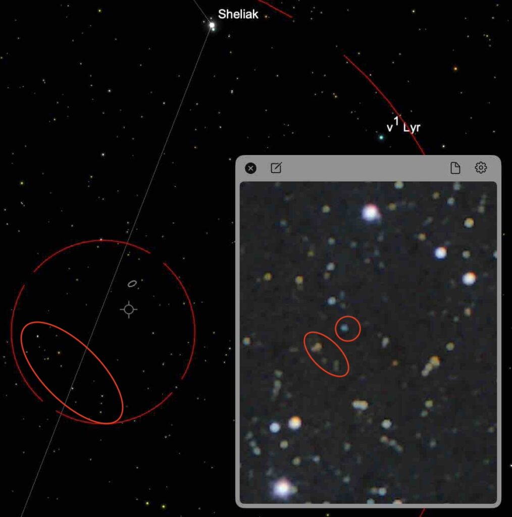 Die beiden 7m-Sterne nordöstlich und südwestlich des Clusters helfen bei der Orientierung. Auf der Ostseite stehen zwei enge Sternpaare, die an Epsilon Lyrae erinnern. Bei den schwachen Bedingungen sehen sie im 6-Zoll allerdings wie Einzelsterne aus. Das Muster unmittelbar westlich ähnelt dem Teapot, in SkySafari ist es unscheinbar, im Okular aber auffällig und auf Fotos klar erkennbar. Die wenigen verbleibenden 12m-Sterne sind indirekt gerade noch sichtbar, im Nordwesten herrscht dann auffallende Leere.