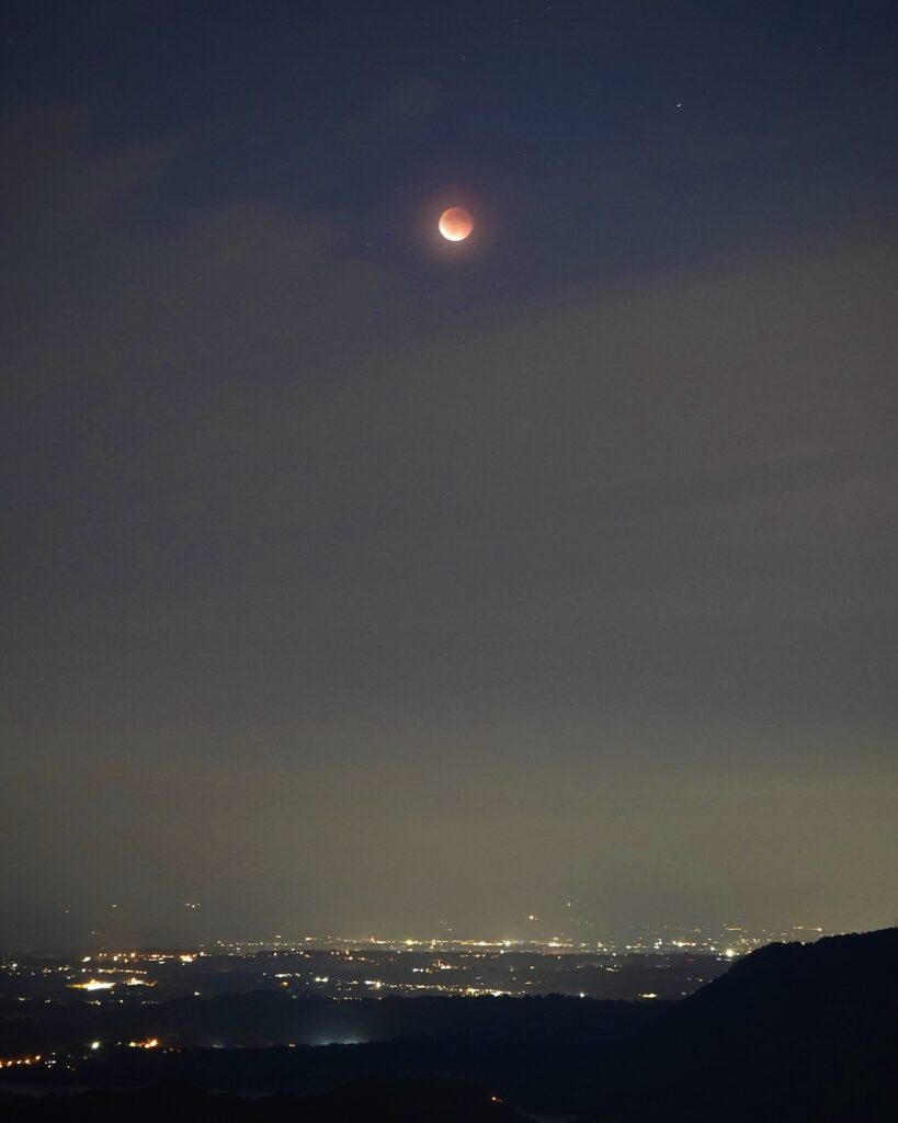 Eine Stunde verstreicht, wir werden langsam müde und kalt, da passiert es. Gegen 20:40 reißt ein Loch in den Wolkenschleier und gibt den Blick auf eine wunderbar rötliche Mondkugel frei, die bereits überraschend hoch am Himmel über den Lichtern der Ebene steht. Unter den Beobachtenden breitet sich wohlige Zufriedenheit aus und die Kameras beginnen zu klicken. Nach kurzer Zeit beginnt der Mond schon aus dem Erdschatten zu wandern. Wir sehen noch ein bisschen zu und gehen dann zum Auto, froh und stolz, dass unser Ausharren belohnt wurde.”