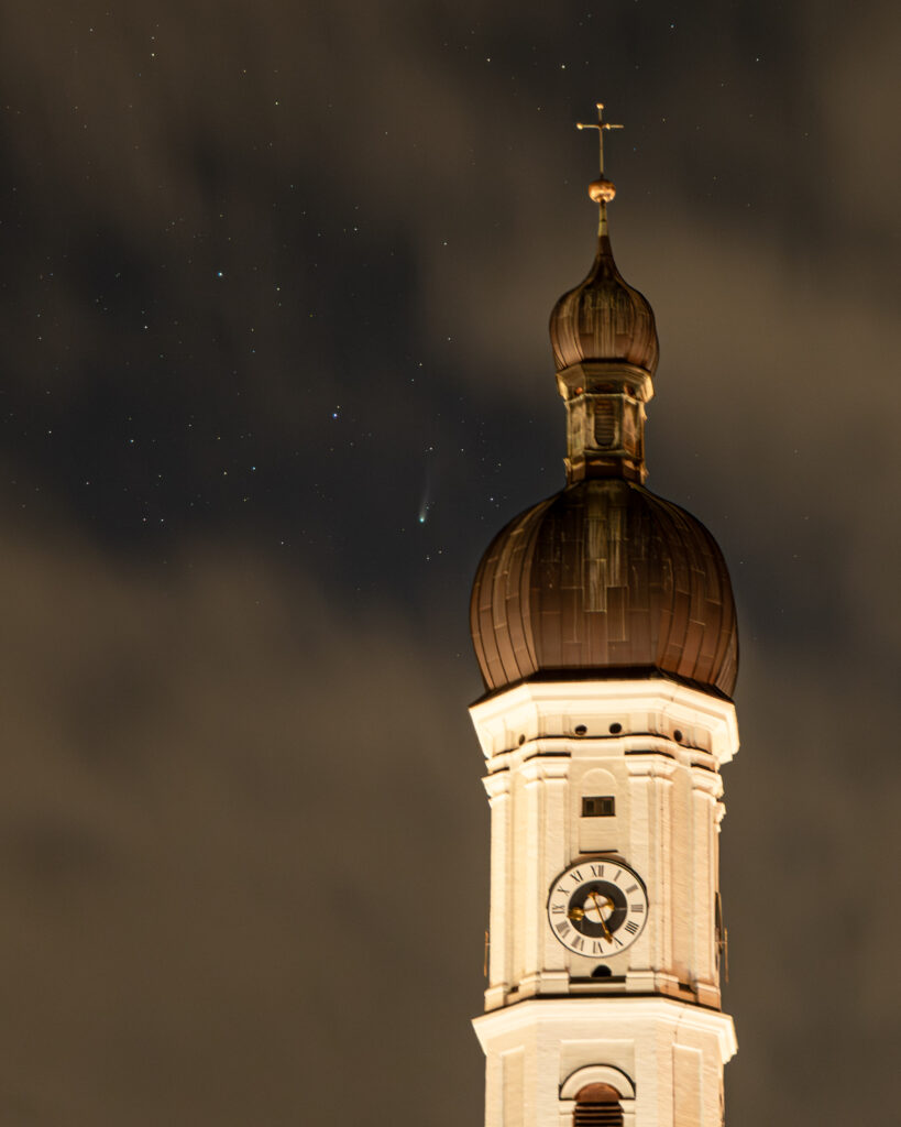 Jakob fotografiert Komet C/2025 A6 Lemmon durch die Wolken. Stacking entfällt wegen der Wolken, die Einzelaufnahme ist spektakulär genug. Für das freie Auge ist der Komet aus der Stadt leider nicht zu erreichen. Vielleicht gestattet das Wetter noch einen Blick mit dem Fernglas oder Teleskop.