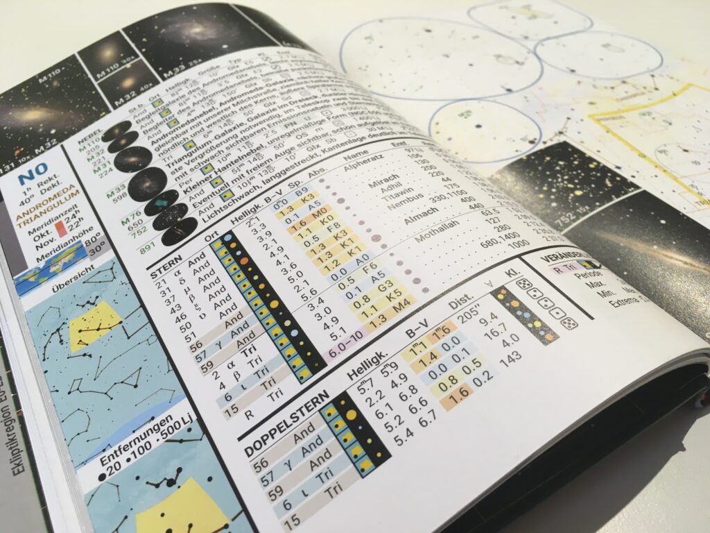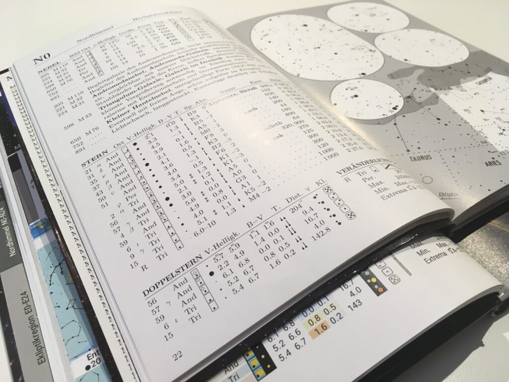 Für mich hatte der “Karkoschka” immer diesen Appeal, schon wegen der Typografie. Leicht zugänglich fand ich ihn nicht, dafür sorgen Tabellen im Einführungsteil wie “Scheinbare Helligkeit und Entfernung der 1427 in diesem Atlas katalogisierten Objekte, jede Doppelsternkomponente einzeln gezählt”.